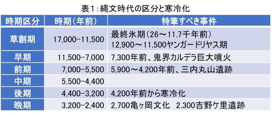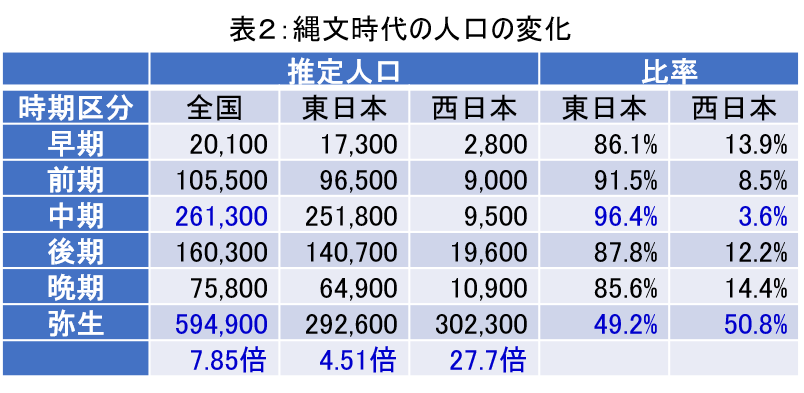 ①寒冷化の結果、縄文時代の人口が激減し(中期→晩期に1/3以下に減少)、人々が東から西へ民族大移動を始めた。東から西へ人口や力の重心が移動した。